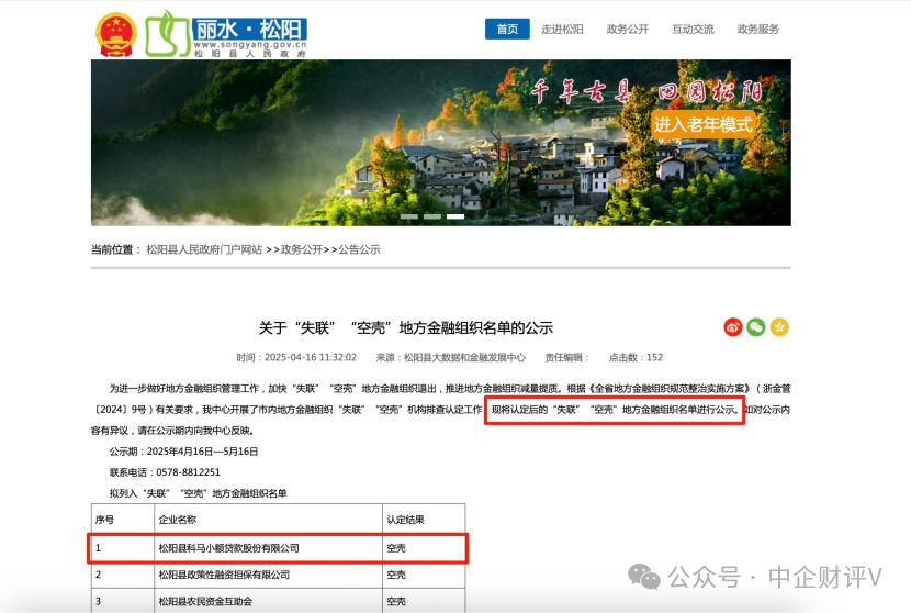 但据松阳县人民政府门户网站在2025年4月16日发布的《关于“失联”“空壳”地方金融组织名单公示》显示,科马小贷被松阳县大数据和金融发展中心认定为“空壳”金融机构。