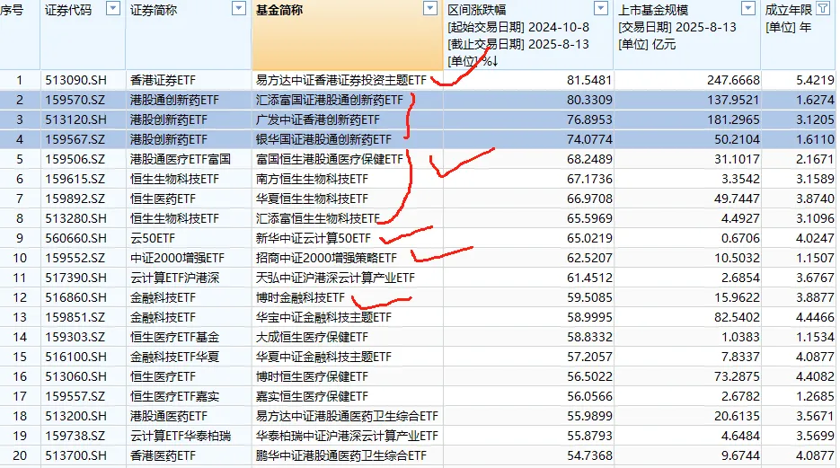 最后,本文最重要的是,在同类基金里找到了最强的产品,分别如下:香港证券ETF、港股创新药ETF、云50ETF、中证2000增强ETF、金融科技ETF。