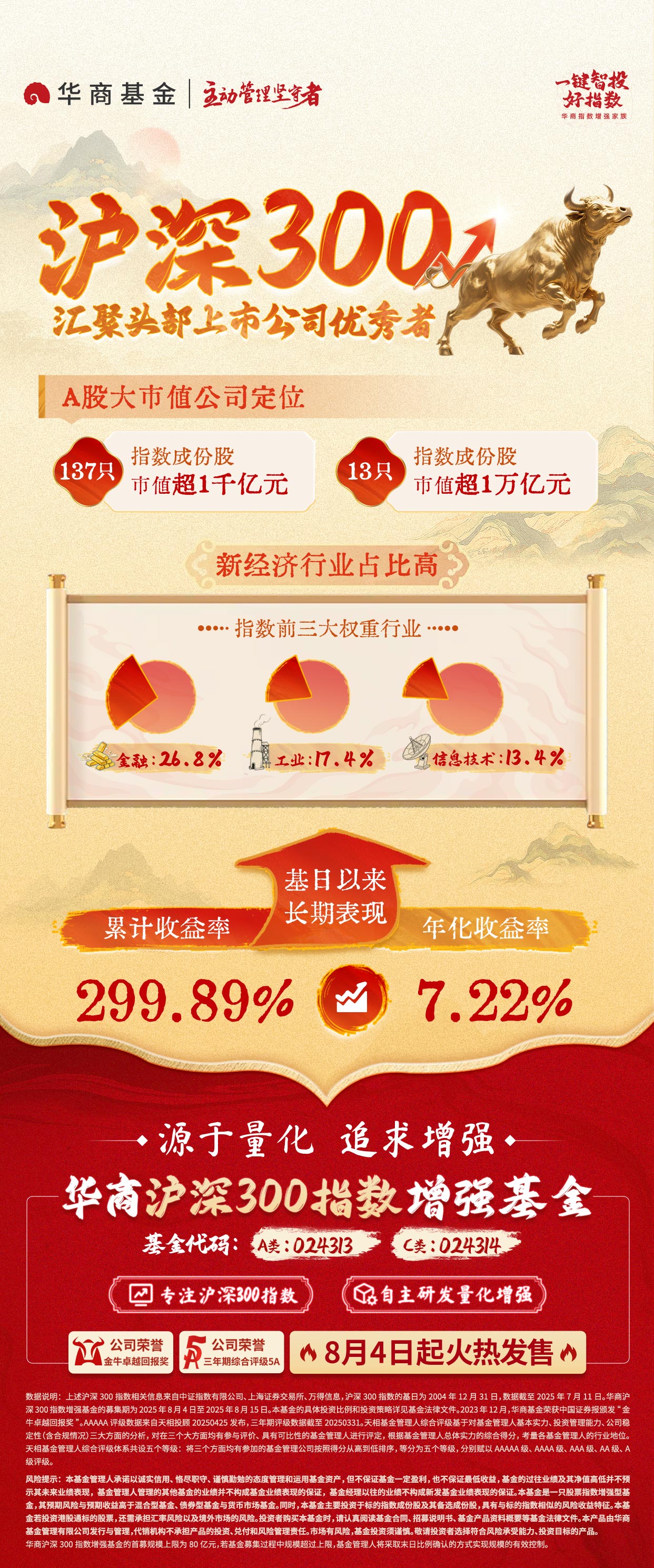 风险提示:华商沪深300指数增强基金的首募规模上限为80亿元,若基金募集过程中规模超过上限,基金管理人将采取末日比例确认的方式实现规模的有效控制。基金管理人承诺以诚实信用、恪尽职守、谨慎勤勉的态度管理和运用基金资产,但不保证基金一定盈利,也不保证最低收益,基金的过往业绩及其净值高低并不预示其未来业绩表现,基金管理人管理的其他基金的业绩并不构成基金业绩表现的保证,基金经理以往的业绩不构成新发基金业绩表现的保证。本基金是一只股票指数增强型基金,其预期风险与预期收益高于混合型基金、债券型基金与货币市场基金。同时,本基金主要投资于标的指数成份股及其备选成份股,具有与标的指数相似的风险收益特征。本基金若投资港股通标的股票,还需承担汇率风险以及境外市场的风险。投资者购买本基金时,请认真阅读基金合同、招募说明书、基金产品资料概要等基金法律文件。以上内容不代表投资建议,市场有风险,基金投资须谨慎。敬请投资者选择符合风险承受能力、投资目标的产品。