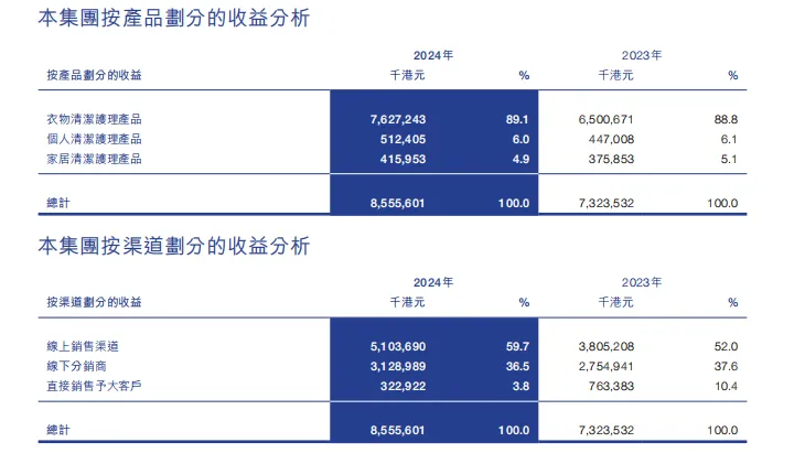 在加大线上销售费用的推动下,蓝月亮2024年线上渠道收益首次超过51亿港元,占比也达到了59.7%,一举打破了此前连续4年在37亿港元~38亿港元之间的徘徊。