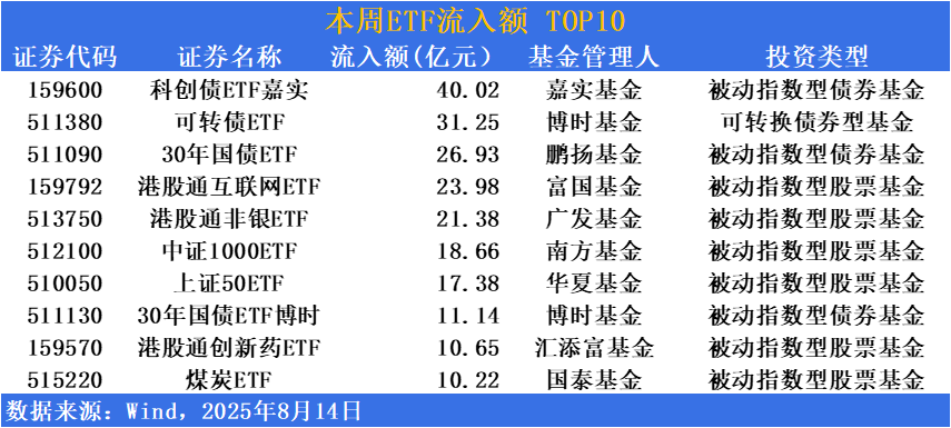 本期(2025年8月11日-8月14日),一方面在成长类ETF获利了结之余,债券ETF的规模继续稳步增长。机构认为,当然如果利率能重回前高,应该是坚决加仓买入的机会。总体来看债券类ETF近期持续受到资金关注。30年国债ETF(511090)、科创债ETF嘉实(159600)、可转债ETF(511380)流入量均超25亿。