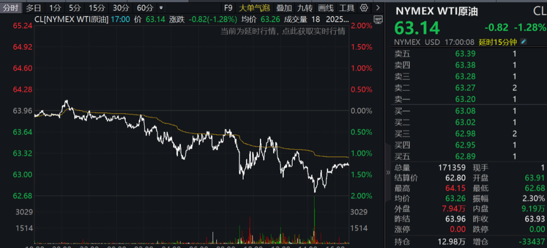 上述消息,直接影响了国际油价的走势。本周五,在俄乌局势有望缓和的背景下,国际油价大幅跳水,WTI原油盘中跌幅一度接近2%,ICE布油一度下跌1.66%。截至收盘时,WTI原油、ICE布油分别下跌1.28%、1.06%,分别报63.14美元/桶、66.13美元/桶。自7月底以来,WTI原油已累计下跌10%。
