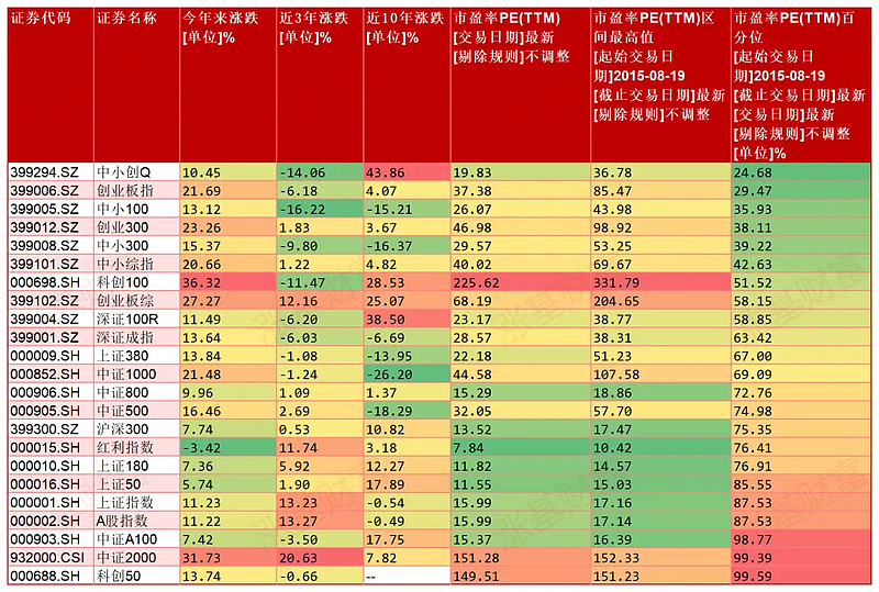 沪指在创近10年新高后,估值到了近十年PE分位数的87.53%;沪深300指数位于十年PE分位数的75.35%;深证成指位于十年PE分位数的63.42%。
