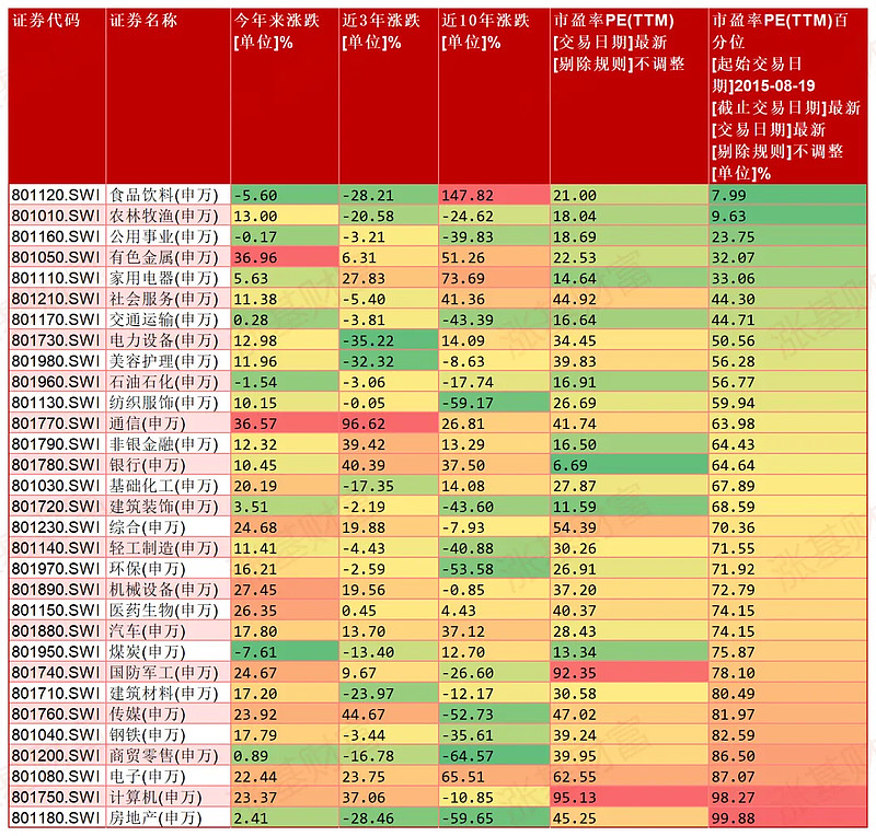 行业板块方面,计算机、电子、传媒、军工等板块的估值也处于十年高位,食品饮料、农林牧渔等板块相对较低。