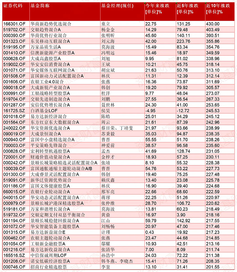 从近10年的数据来看,华商新趋势优选、交银趋势混合这两只基金涨幅超过了4倍。