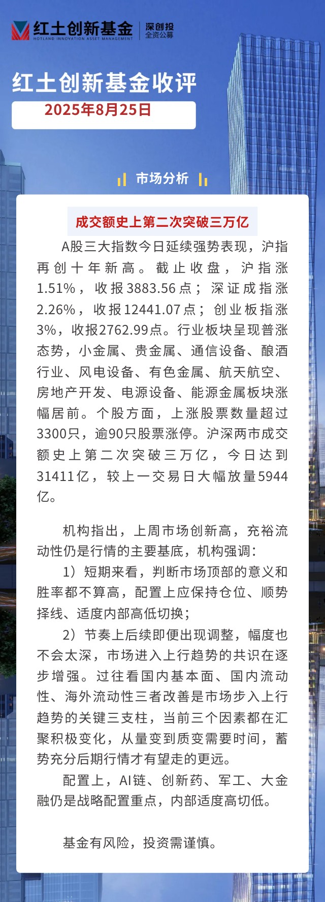 【红土创新收评】成交额史上第二次突破三万亿(2025-8-25)