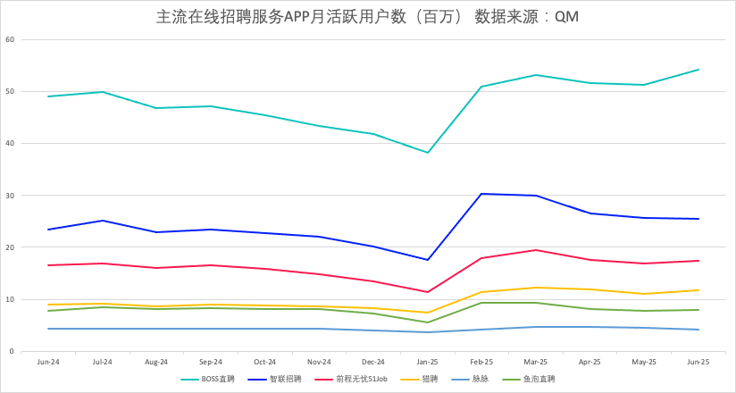 其中BOSS直聘在春招后仍然保持了上涨的势头,2025年6月MAU达到5400万。