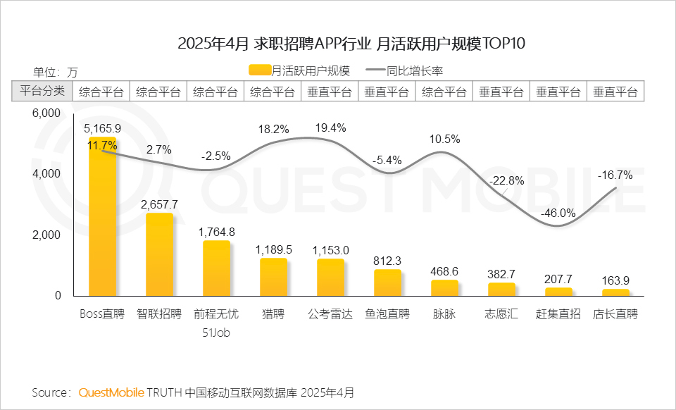 QuestMobile数据显示,2025年4月,求职招聘类App的整体月活用户数约1.13亿,同比上涨5.5%。