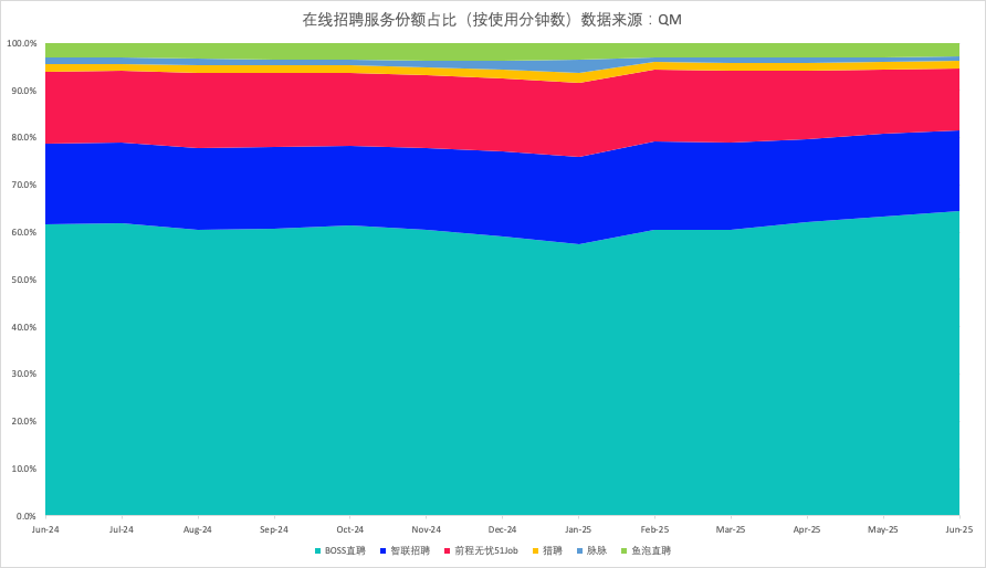 其中排名第一的BOSS直聘,占比从2025年4月的62%,提升至2025年6月的64.5%。