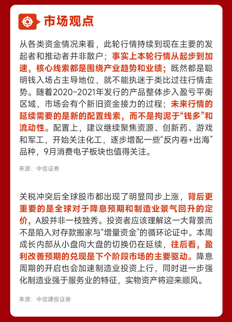 随着2020~2021年发行的产品整体步入盈亏平衡区域,市场会有个新旧资金接力的过程;未来行情的延续需要的是新的配置线索,而不是拘泥于“钱多”和流动性。配置上,建议继续聚焦资源、创新药、游戏和军工,开始关注化工,逐步增配一些“反内卷+出海”品种,9月消费电子板块也值得关注。