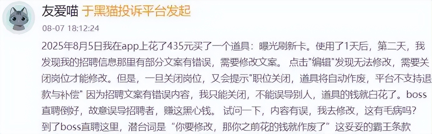 更有企业主则在黑猫投诉上表示,自己在app上花了435元买了曝光刷新权益,上传招聘信息后,发现部分文案填错了,但BOSS直聘平台却显示要先关闭岗位才能修改。然而,一旦关闭岗位,平台又会提示“职位关闭,道具将自动作废,平台不支持退款与补偿”,那权益的钱就白花了。