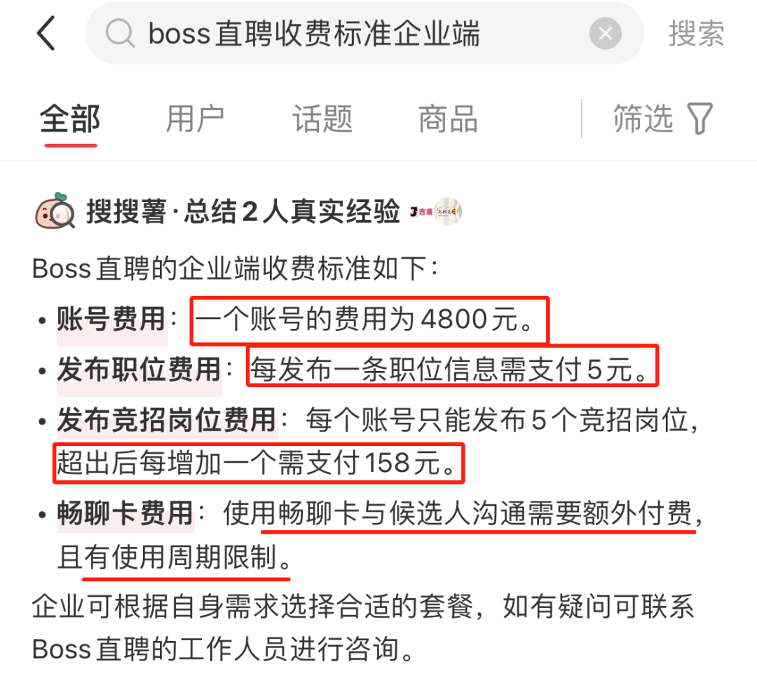 早在2021年赴美上市前夕,BOSS直聘就被指“通过削弱原功能的使用体验,引导用户使用付费功能”。据当年的报道,平台原有的关键词搜索功能被下线,HR只能通过信息流推荐筛选简历,但由于推荐算法精准度低,引发用户吐槽:“看IOS开发的职位,推荐一堆Android开发的同学来。”“我要招全职,却全给我推大二、大三的在校生。”