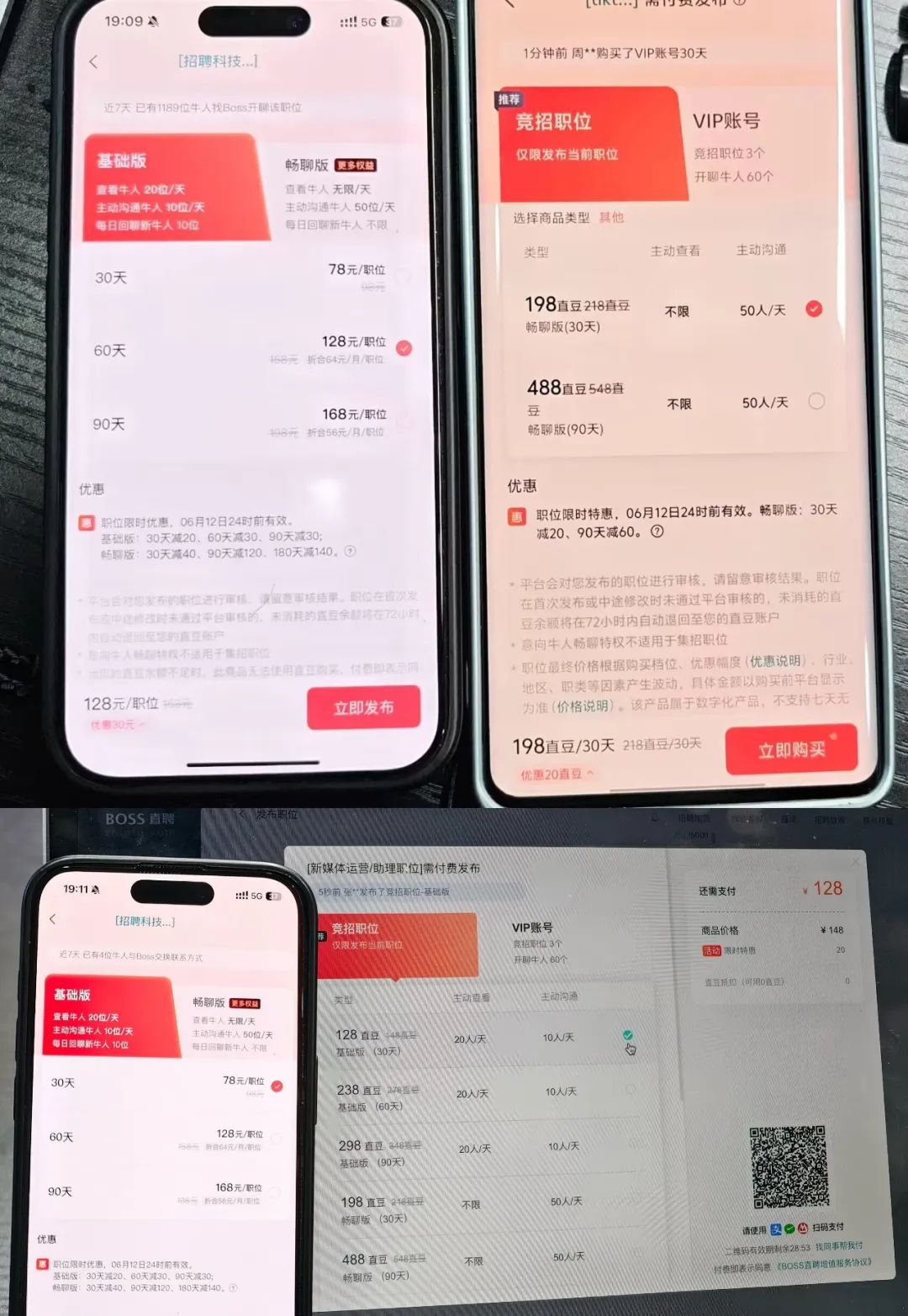 另有HR网友则表示,BOSS直聘的套餐费用也不透明,“去年我们公司的账号年费是1.2万元,今年却要1.6万元”。金角财经用两个账号测试后发现,购买同样的招聘服务,A账号要付128元,B账号却要付198元;手机端的价格为78元,电脑端则要128元。