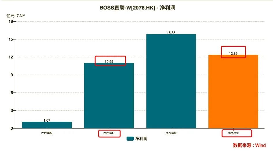 2025上半年报显示,BOSS直聘营收40.26亿,同比增长11.2%;净利润12.35亿,同比增长85.2%。而在2023年,其净利润“仅”为10.99亿元。意味着,如今短短半年,就赚了2023年全年的钱。