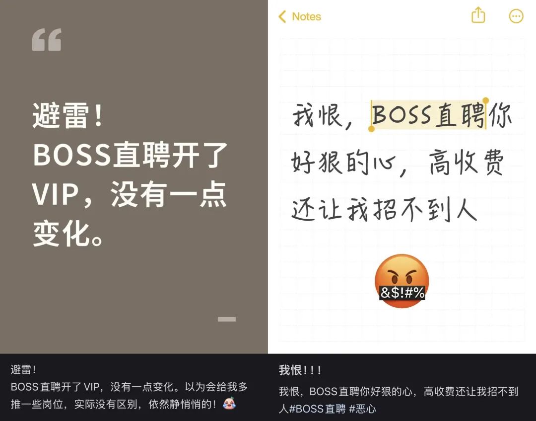 据《DT商业观察》统计,截至2024年6月18日,小红书的“BOSS直聘”的笔记相关笔记阅读量TOP10中,超过一半是表达不满情的,比如《BOSS直聘都这么搞笑的吗》预估阅读量72.7万、《用BOSS直聘,错过了太多双休好工作》预估阅读量40万。