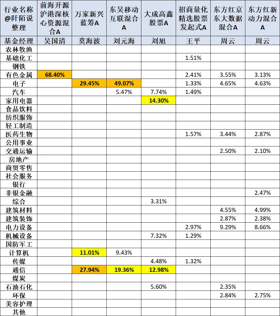 我们看基金经理布局的申万一级行业,截至2025年6月30日,7只基金布局的行业展示如下(目前只披露了二季报,而不是中报,统计的应该是前十大重仓股而不是全部持仓),我将持仓占比大于20%的以橘色做了标识,介于10%-20%的以黄色做了标识。$东方红新动力混合A(OTCFUND|000480)$$东方红京东大数据混合A(OTCFUND|001564)$#社区牛人计划##基金投资指南##炒股日记#@天天基金网 @天天基金研究中心 @天天基金创作者中心