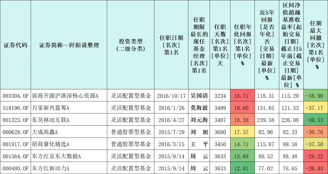 将上榜的基金多份额仅保留A类,合计有7只基金,我将它们按照基金经理任职以来的回报由高到低排序如下,上榜的有吴国清、莫海波、刘元海、刘旭、王平和周云,其中周云有两只上榜。