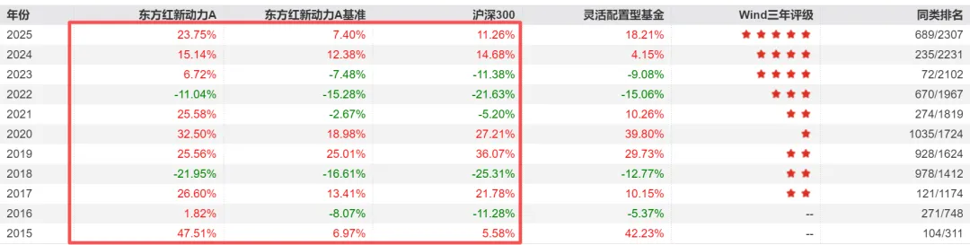 我们以东方红新动力A为例,下图是它过去十一年的区间回报,2015年周云是中途接手的,该年份涨幅47.51%,同期沪深300涨幅仅5.58%。