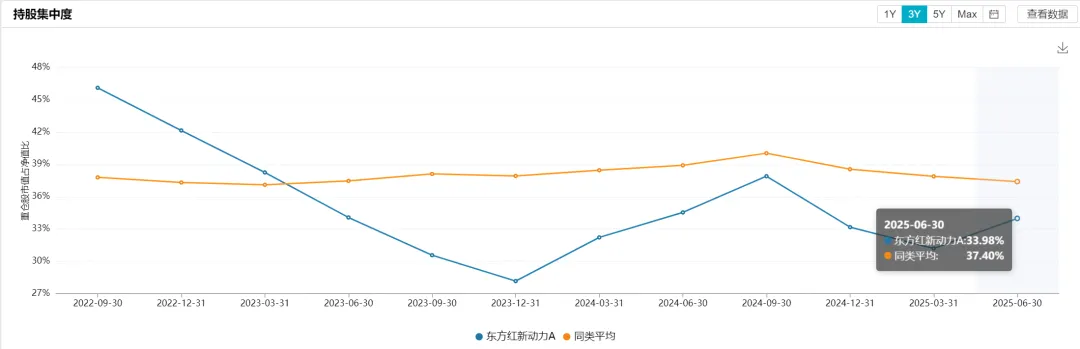 持仓集中度方面,最新一期(20250630)是33.98%,低于同类平均的37.40%,也是比较分散的。