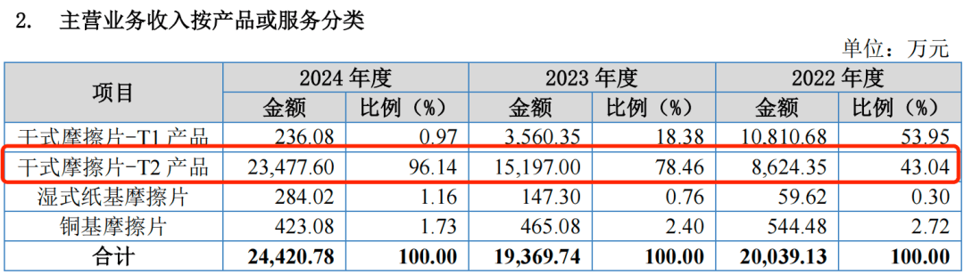 报告期内,公司干式摩擦片(T2产品)的收入占主营业务收入的比例分别为43.04%、78.46%和96.14%,逐渐提升。