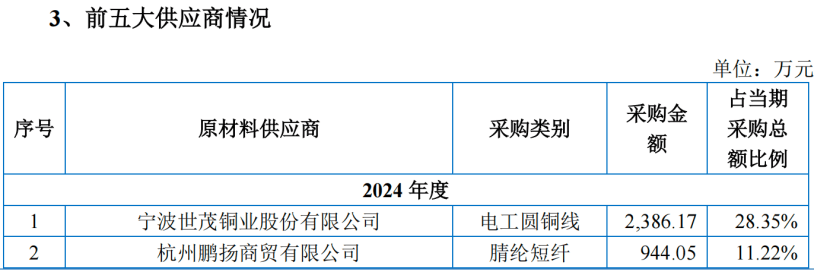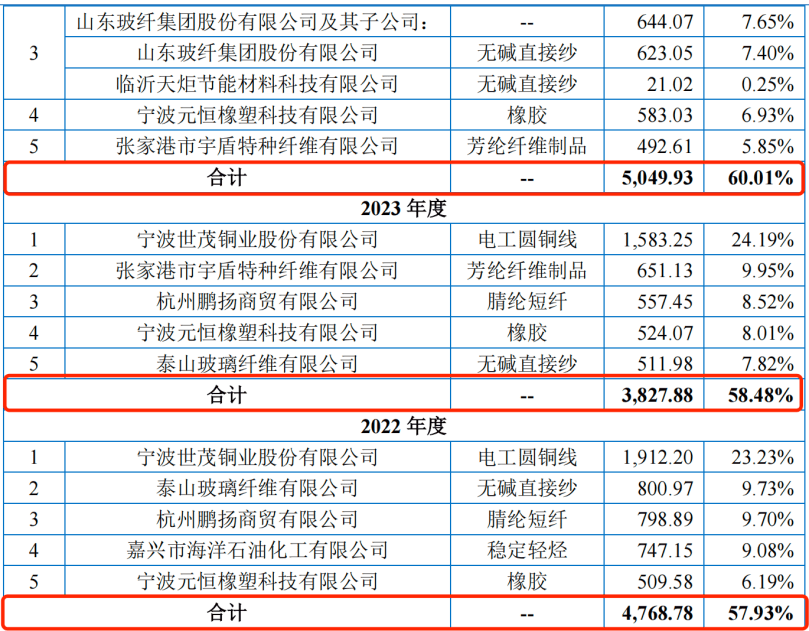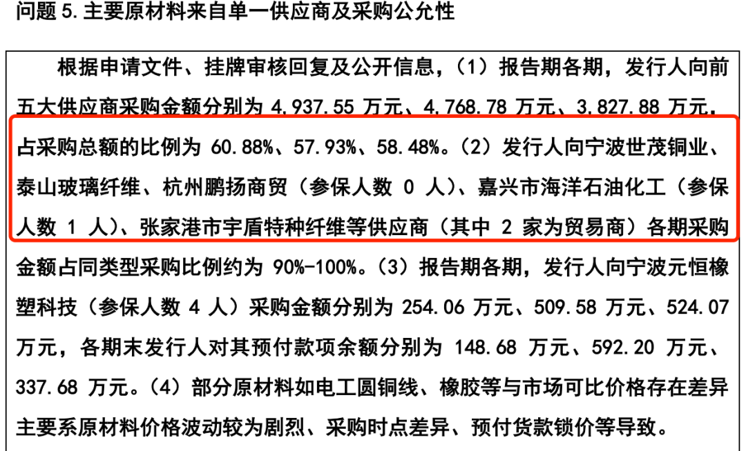 报告期内,公司向前五大供应商的采购金额分别为4768.78万元、3827.88万元和5049.93万元,占当期采购总额比例分别为57.93%、58.48%和60.01%,主要向供应商采购电工圆铜线、芳纶纤维制品和橡胶等原材料。