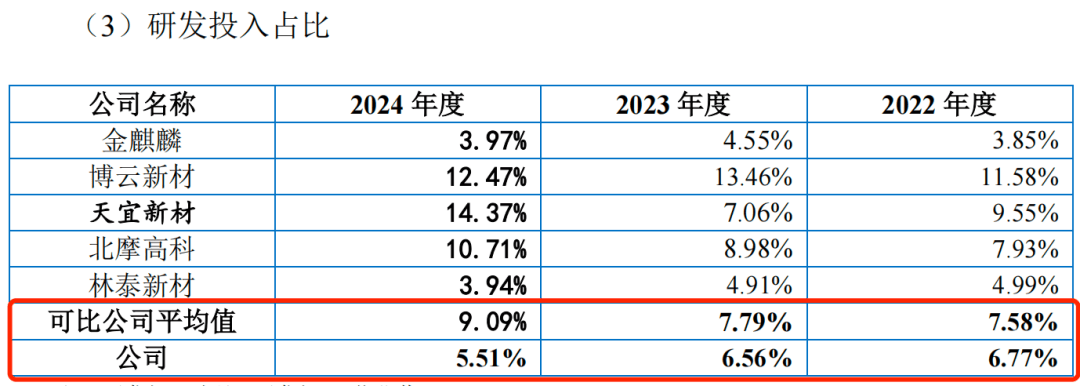 同期,科马材料同行科比公司的研发费用率平均值分别为7.58%、7.79%和9.09%,远高于科马材料的研发费用率水平。