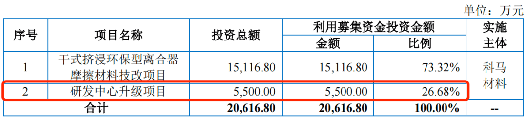 此次IPO,科马材料拟募集5500万元用于研发中心升级项目。公司在招股书中表示,研发中心升级项目建成后,公司将积极围绕干式摩擦片及湿式纸基摩擦片开展新工艺、新材料、新产品的研发工作。
