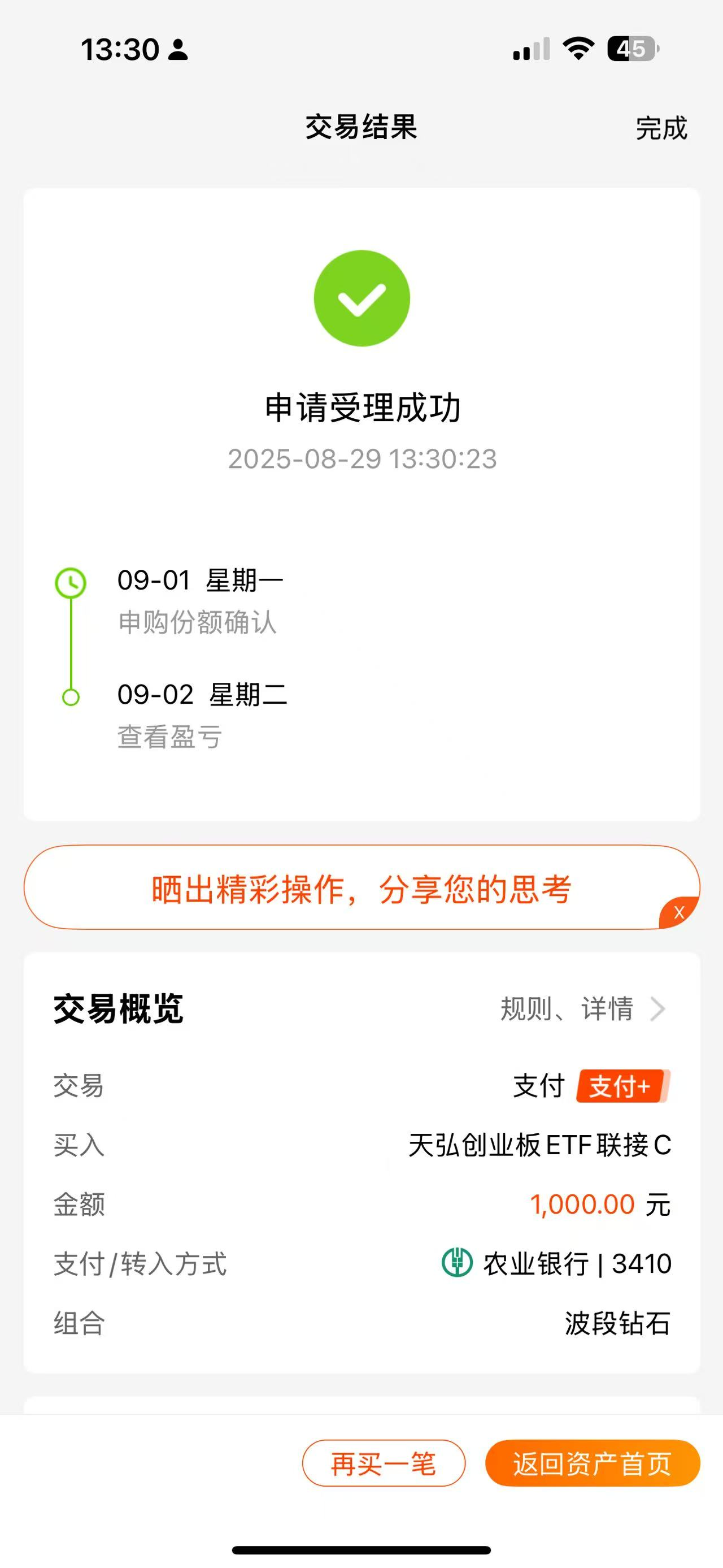 操作:顺势上车1000元$天弘创业板ETF联接C(OTCFUND|001593)$基金,这只基金跟踪创业板指数,创业板的核心优势在于成长性和行业代表性,创业板指数覆盖“硬件+软件+应用”全链条,其中硬件占比最高,尤其侧重光模块、芯片等AI算力相关领域,是当下市场重点领涨的方向。特别是今年8月以来,创业板指弹性凸显。