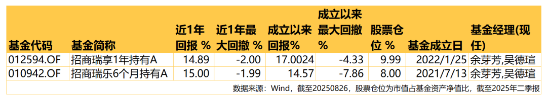 余芽芳、吴德瑄管理的招商瑞享1年持有A(012594)、招商瑞乐6个月持有A(010942),就是以固收作为底仓,筑牢安全垫,再通过小仓位参与科技成长板块,赚取高增长带来的超额收益。