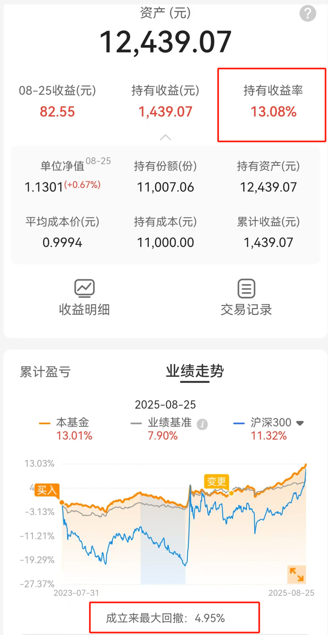 更让我在意的是截图最下面的一行数据:这只基金成立两年多,最大回撤才4.95%。我特地查了同期市场表现,同一时间段里,沪深300的最大回撤可是超过了21%,差了4倍多!