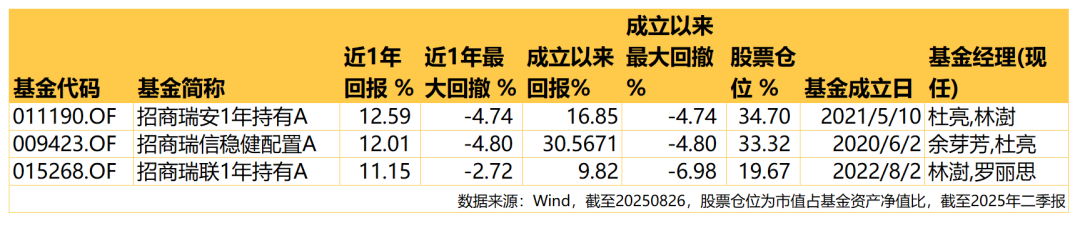 招商瑞成是高波“固收+”,权益仓位在10%-30%;招商瑞泽、招商瑞泰是“中高波固收+”,历史权益仓位都低于20%。