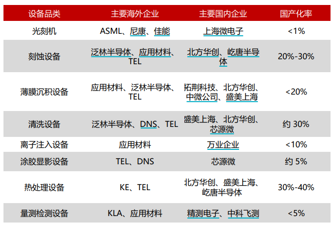 设备方面,主要环节国产化率不足30%,其中光刻机更是不到1%。