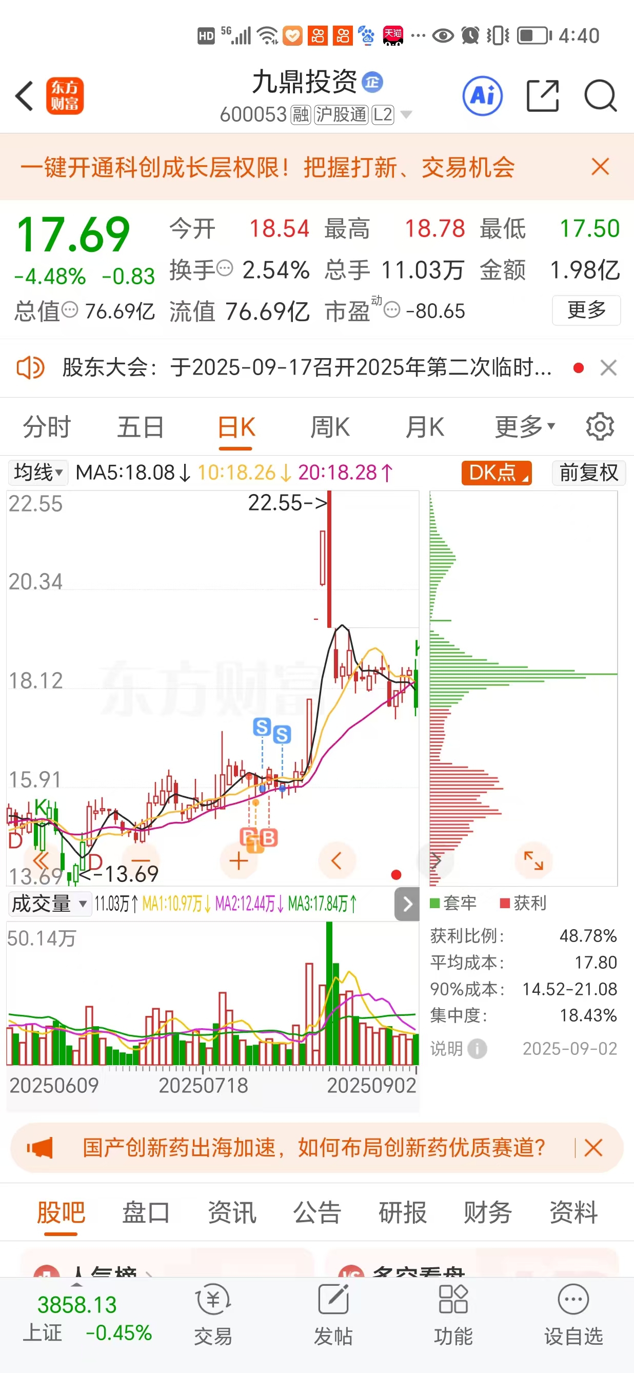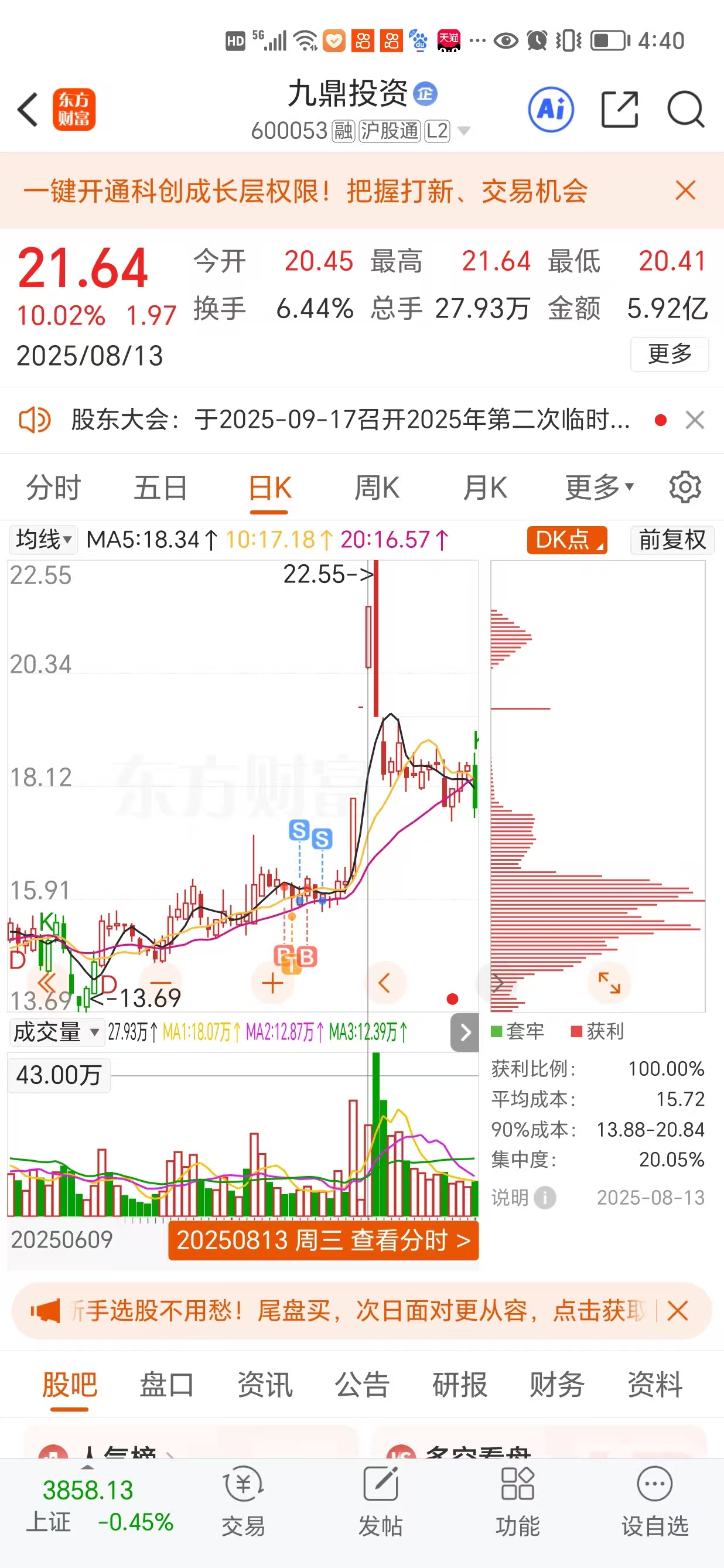 $武汉凡谷(SZ002194)$ 上两天我发了一个凡谷高位筹码峰过大,肯定还要洗,很多人不认同,我觉得还是有用的,特别是较长时期跟踪一直股票确认买入点有价值,九鼎投资我观察了很久,他一直沿着20丝线震荡,并且高位筹码几乎没有,低位筹码长期不动。就在7月29日买入,8月5号看到凡谷有动迹象,就出来全仓买入了凡谷。虽然凡谷赚了点钱,但是三天后九鼎投资三个板错过了,现在九鼎投资低位筹码明显松动,就放弃了。主力不会去的管各种指标,只有成交量和筹码有点价值。