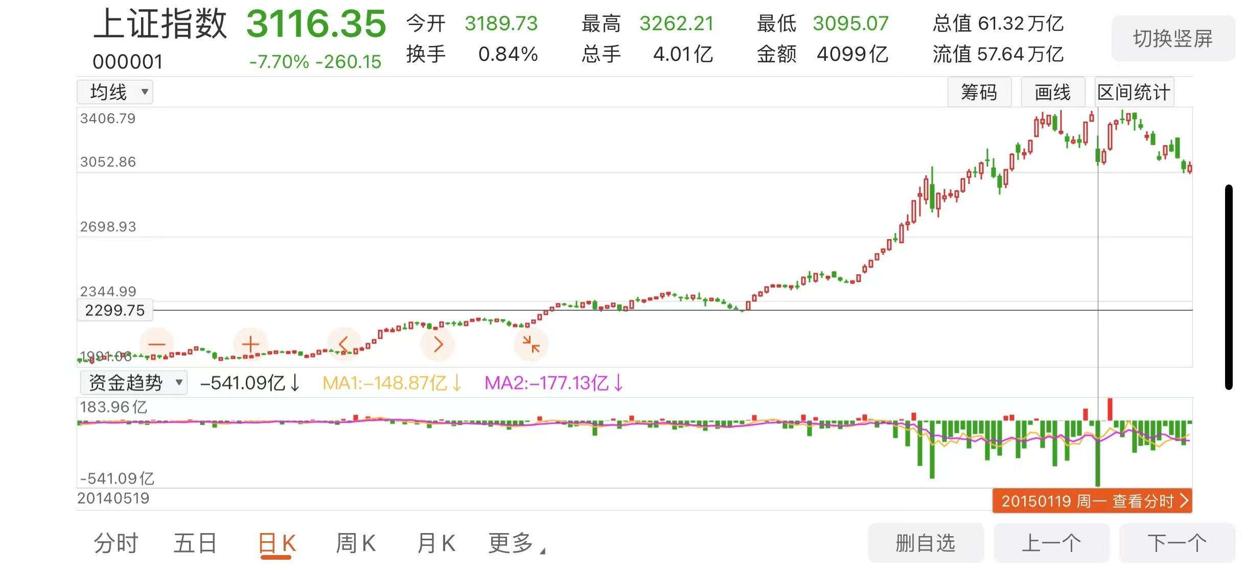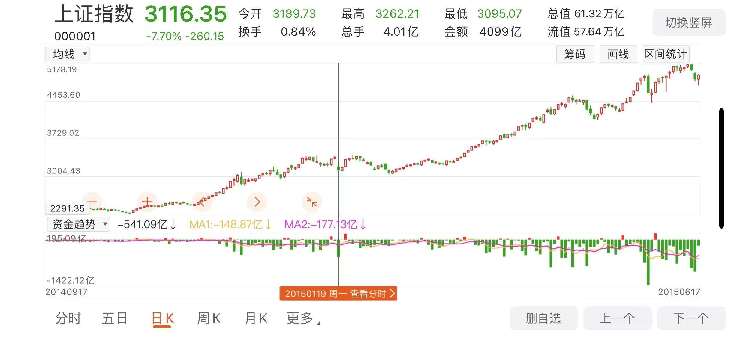 不过大家也不必慌,牛市也不是天天涨的,你看上一轮2015年牛市,(下图)这里看着很高了,当天大盘指数还暴跌7.7%,意味着基本“满盘皆跌停”。