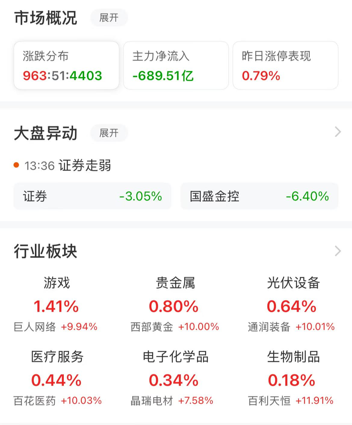 盘中游戏,光伏,贵金属,电池等领涨,军工,船舶,证券,多元金融,保险,通信,有色,软件等领跌。