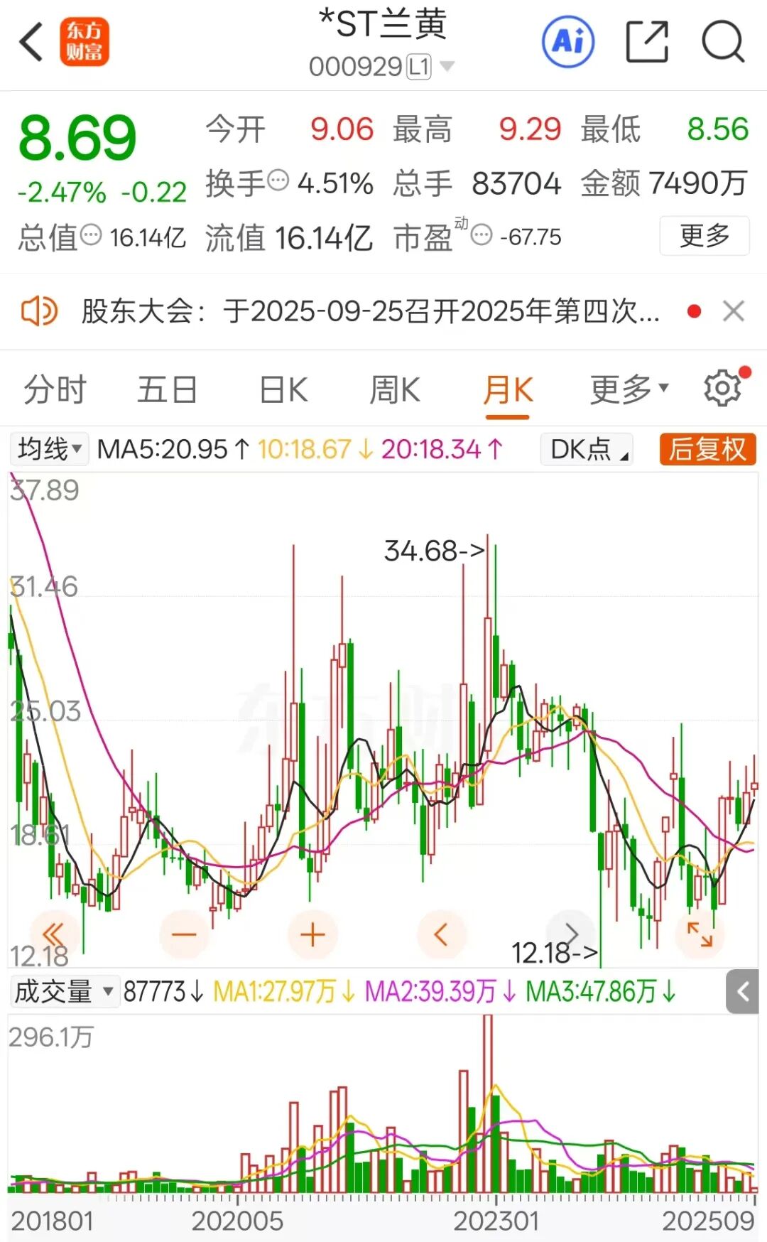 兰州黄河股票在今年4月30日被实行“退市风险警示”,股票简称变更为“*ST兰黄”,原因是公司2024年度利润总额、净利润、扣除非经常性损益后的净利润三者均为负值,且扣除后的营业收入低于3亿元,触及《深圳证券交易所股票上市规则》第9.3.1条第(一)款情形。