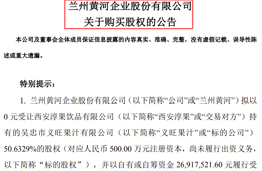 9月4日晚,兰州黄河(即*ST兰黄)公告称,公司拟以0元受让西安淳果饮品有限公司(以下简称西安淳果)持有的吴忠市义旺果汁有限公司(以下简称义旺果汁)50.6329%的股权,并以自有或自筹资金2691.75万元履行受让标的股权项下所对应的全部出资义务,其中500万元计入标的公司注册资本,2191.75万元计入标的公司资本公积。