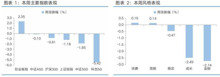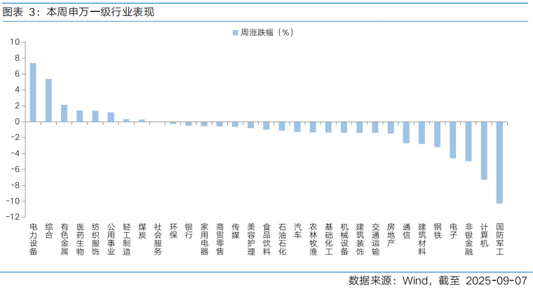本周市场迎来调整,在9.3阅兵活动牵引的情绪变化下,前期积累的获利盘迎来集中兑现,大盘周二、周三、周四连跌三日,不过回调后周五便迎来反弹,上证指数重返3800点上方,意味着市场支撑依然较为稳固。全周来看,科创板块调整幅度较大,创业板则在新能源板块带动下,主要系市场热点从AI算力链向电池产业链的轮动切换,此外美联储降息预期升温也推动有色方向涨幅靠前。从宽基指数看,本周上证指数下跌1.18%,创业板指上涨2.35%,沪深300下跌0.81%,中证500下跌1.85%,中证A50下跌0.10%,科创50下跌5.42%。风格上,消费、周期表现相对较好,金融、成长表现较差。从申万一级行业看,表现相对靠前的是电力设备(7.39%)、综合(5.38%)、有色金属(2.12%)、医药生物(1.40%)、纺织服饰(1.37%);表现相对靠后的是国防军工(-10.25%)、计算机(-7.27%)、非银金融(-4.96%)、电子(-4.57%)、钢铁(-3.17%)。从Wind热门概念板块来看,表现相对靠前的是锂电负极(11.49%)、储能(11.45%)、黄金珠宝(9.33%)、锂电池(9.20%)、固态电池(8.79%);表现相对靠后的是军工信息化(-12.12%)、卫星互联网(-11.13%)、航母(-10.69%)、卫星导航(-10.69%)、大飞机(-10.29%)。
