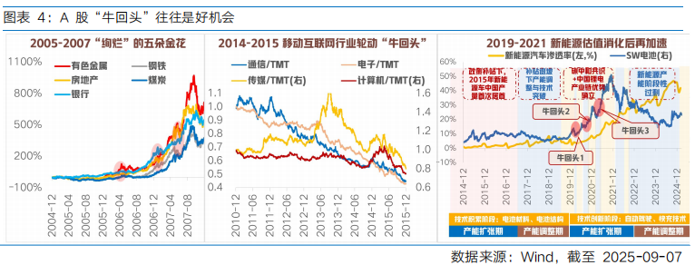 8月AI引领的市场上攻行情在本周市场出现了较为明显的整理,计算机、电子、通信等方向跌幅靠前,但在全球科技创新浪潮之下,AI作为市场一大核心主线的地位短期很难被取代。复盘A股市场“牛回头行情”,当产业浪潮的方向没有改变时,每一次深蹲都是为了未来跳跃的更高。在过去的几轮牛市中,强势板块阶段性跳水并不少见,行情戛然而止还是修整后继续,关键在主线逻辑是否改变。1)2005-2007年“五朵金花”的“牛回头”,是政资博弈的压力测试。此次“牛回头”本质是政策调控(如2006年加息、2007年印花税上调)与资金迁徙的“压力测试”。尽管市场及“五朵金花”板块出现回调,但未改变产业趋势,主要是资金对产业趋势的二次确认——具备“政策刚需+全球竞争力”的标的回调后仍能攀升至估值新高。2)2013-2015年移动互联网的“牛回头”,是行业轮动的故事。TMT板块内部景气从硬件转向软件,外部大类风格则与金融、周期板块切换。2014年两次回调主因估值消化、流动性及政策驱动下的板块资金流动,最终行情从成长牛转向价值牛再至全面牛。软件应用(如传媒、计算机)成为反弹支撑。类比本轮AI时代行情,应用端或成核心。3)2019-2021年新能源的“牛回头”,是估值消化后再加速的故事。尽管受流动性收紧、外盘波动等影响(回调幅度10%-35%),行业凭借基本面韧性(如渗透率突破10%、业绩爆发)快速修复并创新高,核心逻辑为景气周期内的盈利兑现与预期强化。总结来看,产业趋势中的“牛回头”是产业、估值与流动性三重压力测试后的再平衡,短期调整往往由估值与流动性的扰动引起,中长期的涨跌则更多由产业逻辑与周期主导。本周市场尤其是科技方向的整理,或是市场在数月上涨后消化估值泡沫的健康降温行为。市场反弹不仅仅是不利因素的消散,高强度的反弹多伴随产业景气再加码,如产业逻辑持续、业绩验证强化等,此时行业往往能在估值消化后再加速创新高。