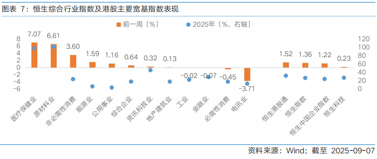 行业表现来看,政策支持与学术会议催化下,创新药板块强势崛起。政策面释放明确支持信号,国务院国资委与中国科学院联合举办中央企业生物科技产业高级研修班,国资委副主任谭作钧明确提出“加快打造生物医药领域国家队”,推动产学研用协同创新。这一表述被市场解读为央企在生物医药领域战略布局提速的信号,强化了产业长期发展确定性。此外,2025年世界肺癌大会(WCLC)于9月6日至9日在巴塞罗那开幕,多家创新药企业计划在会上发布重磅临床数据及新品进展。学术会议催化叠加政策支持,推动市场对创新药企业估值修复的乐观预期。同期,黄金及有色金属板块亦涨幅居前。美联储降息预期升温推动国际金价突破3600美元/盎司,创下历史新高。黄金股带动有色金属板块集体走强,与创新药共同成为本周港股的结构性主线。