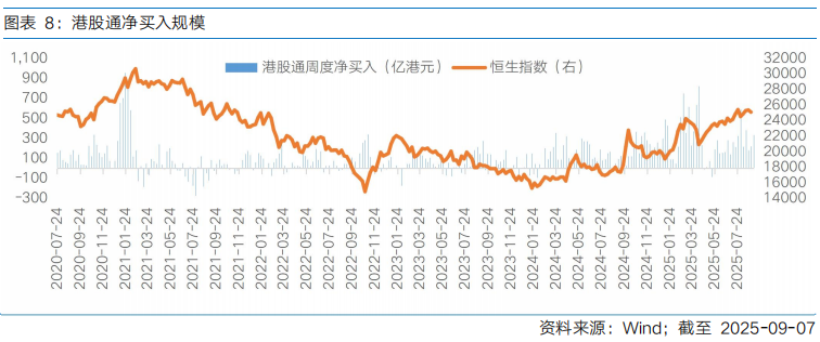 美联储降息预期显著升温,流动性改善利好港股估值。美国就业数据显著不及预期,8月非农就业人数仅增长2.2万人,远低于预期的7.7万和前值7.9万,且6月数据下修至负值,为2020年12月以来首次转负;8月失业率升至4.3%,创2021年以来新高。此外,ADP就业报告也显示出劳动力市场疲软态势,8月新增就业岗位5.4万个,远低于市场预期和前值。职位空缺数降至2024年9月以来最低水平,而失业人数自2021年以来首次超过职位空缺数,显示劳动力市场降温趋势明确。市场对美联储降息的预期急剧升温。截至9月7日,CME美联储观察工具显示,市场定价9月降息至少25bp的概率为100%,降息50bp的概率升至11%。流动性预期改善推动全球风险偏好回升,港股或将受益于流动性改善及估值修复逻,尤其是科技成长板块,有望成为接水的“洼地”。