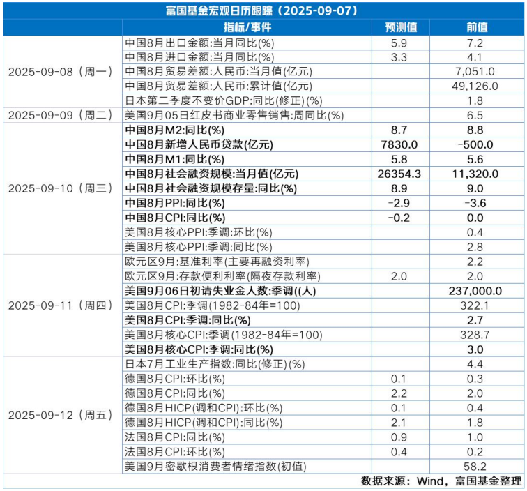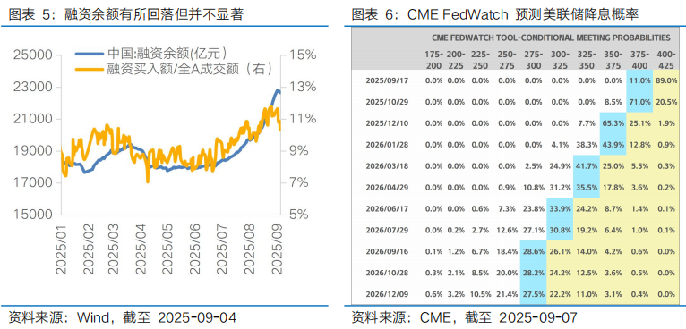 在资金驱动的上涨行情阶段演绎后,开启新一轮趋势性上涨行情或需要新的催化,未来基本面的变化也值得关注。在本周市场调整之际,融资资金有所回撤但并未呈现显著回落,融资余额仍在2.2万亿上方;叠加本周海外美联储降息预期进一步升温,市场风险偏好的支撑仍较强。长期视角下,中国资产“活水”涌现,“类平准基金”的增量子弹托底向下波动、险资中长期入市徐徐增配、居民存款搬家方兴未艾、海外降息外溢美元流动性;“资金流入-赚钱效应-资金流入”的正螺旋已经打开。不过短期来看,在资金驱动的上涨行情阶段演绎后,开启新一轮趋势性上涨行情或需要新的催化,未来基本面的变化也需关注。中报数据显示A股非金融2025Q2盈利出现回踩,国内物价水平依然低迷,企业盈利修复趋势有待新的确认。向后看,9月份是国内“金九银十”开工旺季的起点,加之后续政策层面对于扩内需的鼓励和反内卷的路径进一步明确,基本面信号或预期的变化或带动新的市场机会的出现,同时也需关注外需持续性以及内需结构切换带来的扰动。