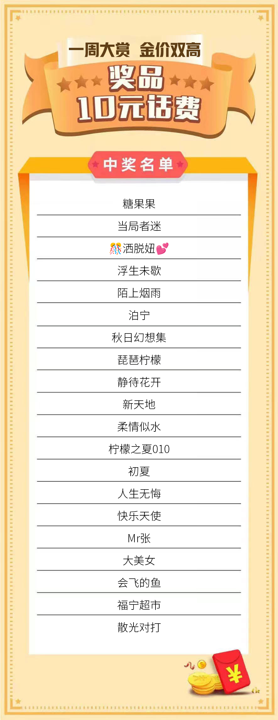 小编将于后台联系获奖的客官,话费将于9月12日(本周五)前充值到中奖客官的手机号码中,请各位客官耐心等待~