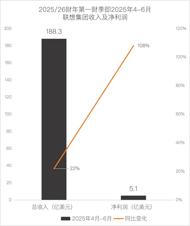 数据则提供了另一种视角:近五年来,联想集团的净利润(公司权益持有人应占溢利)保持在10-20亿美元区间。今年第二季度(2025/26财年第一财季,即2025年4月-6月),净利润更是达到5.1亿美元,同比翻了一倍还多;收入(188.3亿美元)也比去年同期涨了22%。