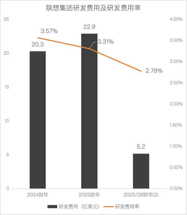 关键在于,联想能否在保持传统优势的同时,真正补齐新技术时代的能力短板。补课需要投入,联想正在加大研发投入力度:2025财年、2025/26财年第一财季(2025年4月-6月)的研发费用分别同比增长12.8%、10.1%,绝对投入金额持续增加。