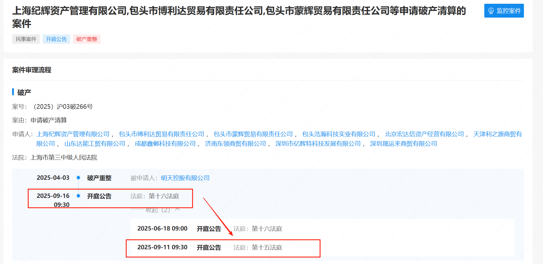 破除清算的开庭时间提前5天,从9月16日提前至9月11日(明日)