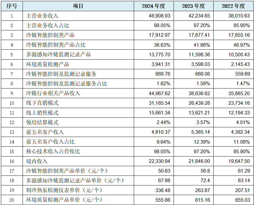招股书中发行人披露其主要产品种类繁多:“公司提供的产品和服务主要为冷链设备智能控制器、节能电控箱、工业冷水机控制器;物联网记录仪、数字温度标签;红外检漏仪、智能歧管仪、智能真空泵等产品以及物联网、云计算等服务。”发行人主营业务收入构成中显示,发行人上述主要产品共分为两硬一软三大类产品(或业务),其中以收入占比高达90.97%的第一类冷链设备智能控制器及监测记录类硬件产品,为发行人的核心业务及绝对收入来源,第二类环境质量检测硬件产品收入平均占比7.41%而作为绿叶存在,至于第三类冷链智能控制及监测记录服务的收入占比仅为1.62%更为可有可无陪衬存在,对于后两类甘为绿叶陪衬的业务我们略过,我们重点分析发行人的绝对核心业务。