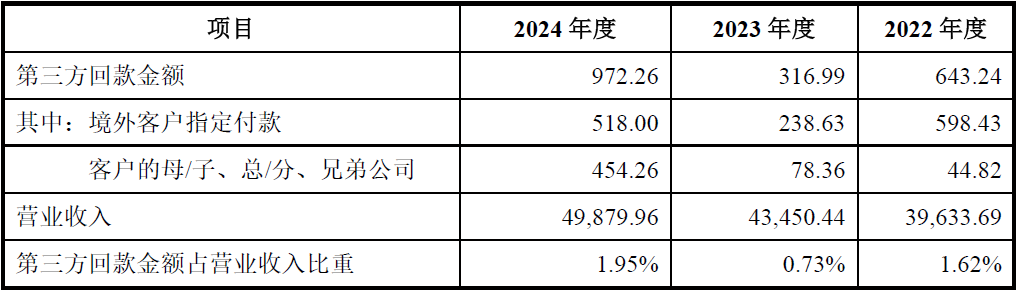 从上表可见,第三方回款占营业收入的比重分别为1.62%、0.73%和1.95%,虽然整体处于较低水平,但难言正常的是每年都有发生,且2022年度及2024年度占比较为均衡,以及2024年度异常增加为454.26万元可能更蹊跷。而明显可见的是境内客户的母/子、总/分、兄弟公司间的代付情况每年都有发生,对于境内客户而言,在网银的普及以及各法人主体的独立核算要求下,代付款作为一种非正常商业行为,本身发生的概率并不高。