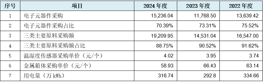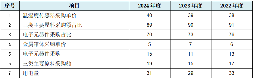 从上表可见,在采购额平均占比超过7成的核心原材料电子元器件的采购及占比数据出现规律性变化的情况下,占比高达9成的前三大原料采购及占比出现数据规律性变化也就可能不奇怪了。此外上表中发行人核心的探头元件温湿度传感器出现采购单价数据规律性变化,以及用电量也出现数据规律性变化。也即从重要性角度而言,发行人高达9成的采购数据出现规律性变化,其真实性也可能同样存疑,当然此作为成本数据真实性存疑的补充,二者不但同时出现也说明二者间相辅相成也相互影响。