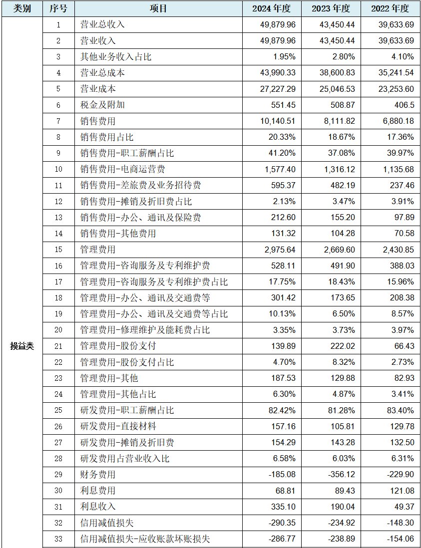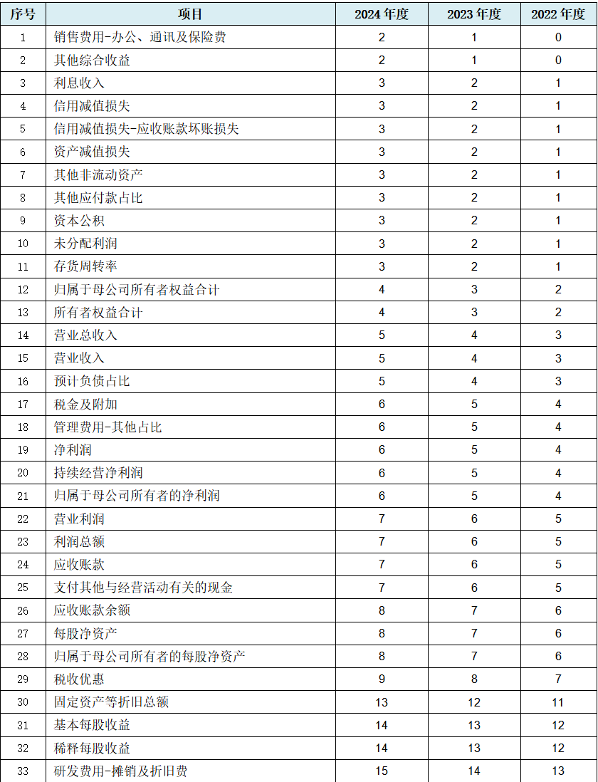 从上表可见,就损益类数据而言,与上文营业收入、营业成本相对应的是,发行人出现营业总收入、营业总成本等直接数据的规律性变化,甚至存在税金及附加数据规律性变化。三大期间费用也同步出现大量数据规律性变化,而财务费用出现多项数据规律性变化情况并不常见,且叠加近乎全部由职工薪酬构成的研发费用中的4项中的3项数据规律性变化。此外还存在营业利润、利润总额、所得税费用、净利润等总类关键盈利数据规律性变化,可能说明发行人利润表整体真实性存疑的概率较高。